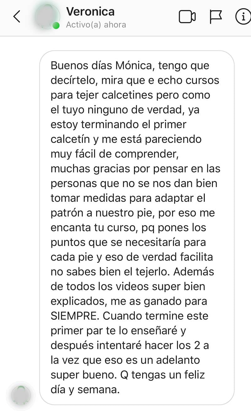 “Tengo el curso de Mónica @pimpamteje también, y desde que lo tengo no para de tejer calcetines, me encanta. Si, pero los cursos tuyos son de calidad. Hay videos gratis útiles pero no te enseñan todo y con tanto detalle. Tus cursos son muy completos!!! No es lo mismo si uno aprende solo o en un curso... Merece muuuucgo la pena !!!”.