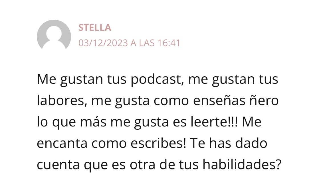 “No estoy especialmente inspirada para enviarte más piropos, pero quiero decirte que tus patrones llegan al corazón, al igual que tus podcast, que al otro lado de la pantalla estamos encantadas y agradecidas por tu esfuerzo y tu trabajo. Ánimo amiga!!!!”