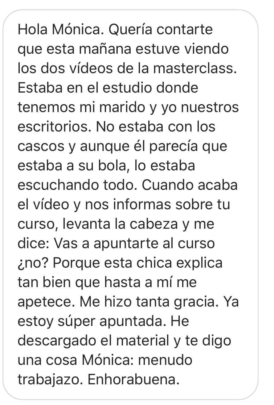 “A mi me gusta reconocer el trabajo de las personas que comparten lo que han aprendido y les ha llevado su tiempo, eso tiene un precio. Si te interesa lo pagas y si no buscas otra cosa, que nunca será lo mismo. Yo estoy encantada con tus cursos y cuando llega el domingo, ¡sorpresa! qué nos contará Mónica en el correo de hoy??”.
