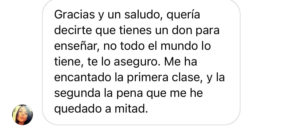 “La manera de enseñar que tiene es ideal, pausada y con calma, además, desgrana cada detalle de como hacer las cosas, hace sencillo lo que a mi me parecia difícil”.