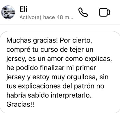 “Explicas muy bien, paso a paso, de forma muy clara. Al ser novata con las agujas circulares pensaba que iba a ser un desastre, pero todo lo contrario. Ante cualquier duda la resuelves lo antes posible y, si es necesario, con otro video.