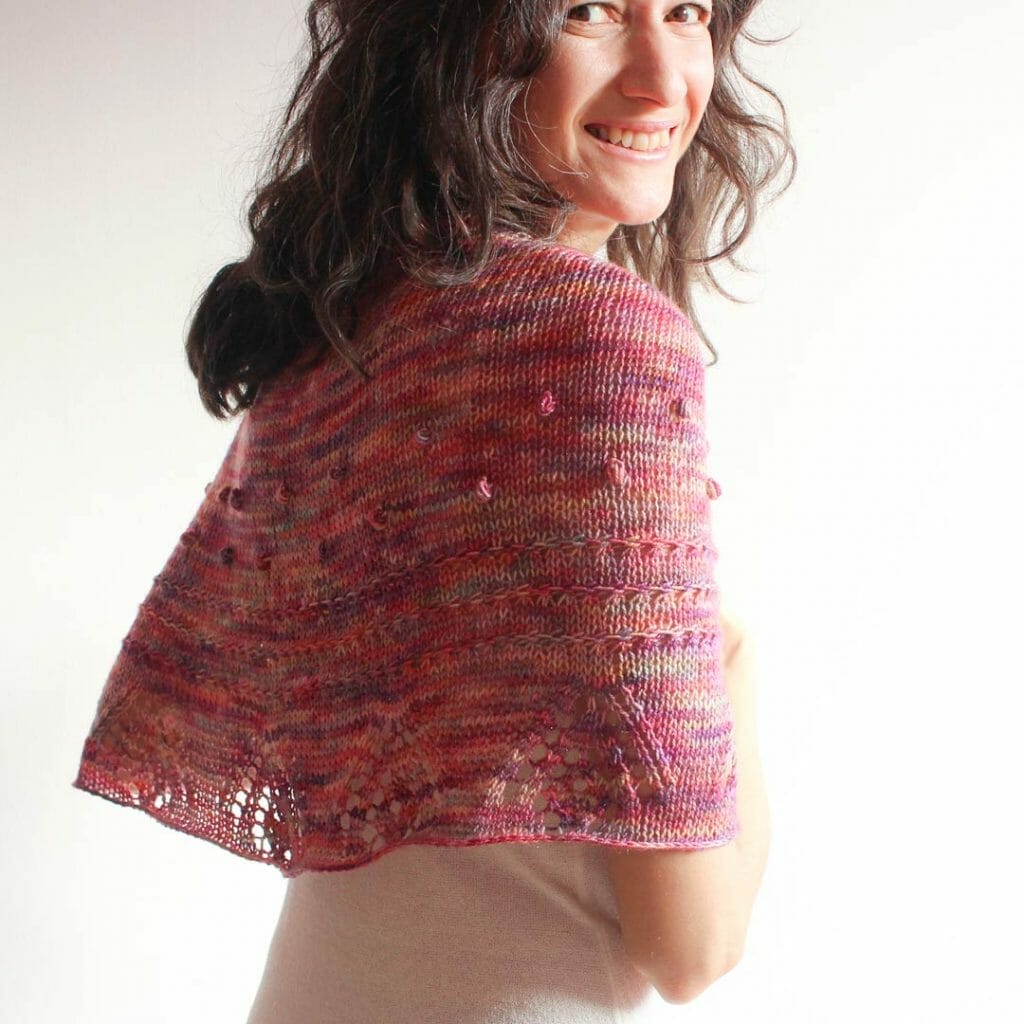 - Patrón de nivel medio para tejer un chal a dos agujas con forma de media luna.